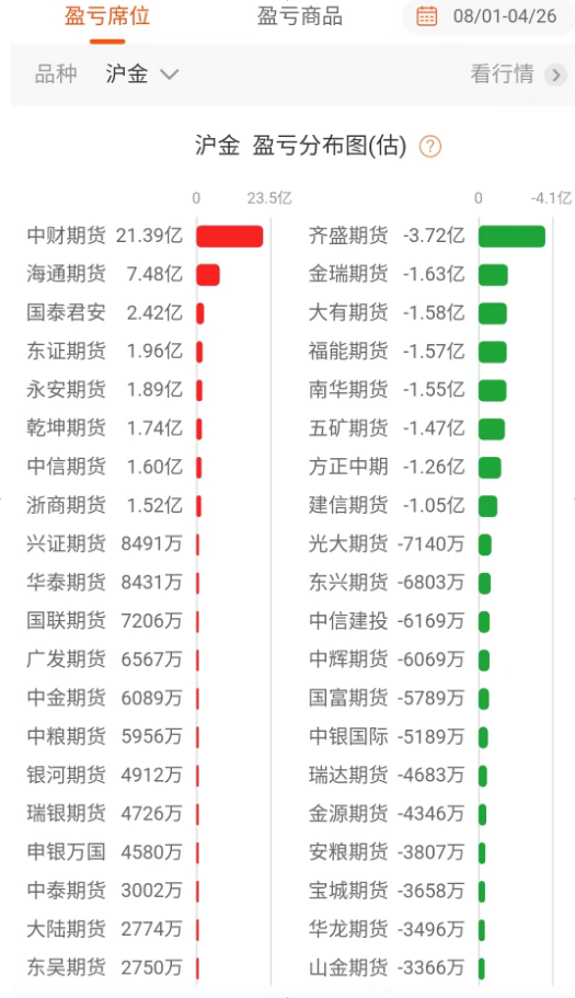 但无论如何,中财期货的上述多头持仓,在近阶段的黄金单边行情中着实获利不菲。据东方财富期货APP测算,自2022年8月以来,中财期货沪金期货头寸已盈利超过20亿元,遥遥领先其他同行。