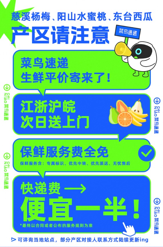 公开信息显示,今年以来,面向生鲜市场,菜鸟速递推出“生鲜平价寄”服务,主打48小时内送货上门、价格减半,做极致性价比。早前已经覆盖杭州西湖龙井、塘栖枇杷以及洛阳新安樱桃等水果主产区。
