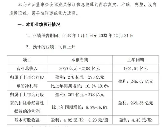 公告显示,公司预计2023年净利润270亿元–293亿元,同比增长10.2%-19.6%;营业总收入2050亿元–2100亿元,去年同期为1901.51亿元。